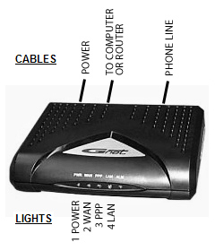5. If the WAN light is off or flashing, unplug the power cable from the modem. Wait one minute, then plug it back in. Wait two minutes for the modem to establish a connection. If the WAN light keeps flashing after two minutes, verify that the correct phone line is connected to the modem. If the WAN light remains off or flashes continuously, contact cpConnect Technical Support via the Contact page or by phone.